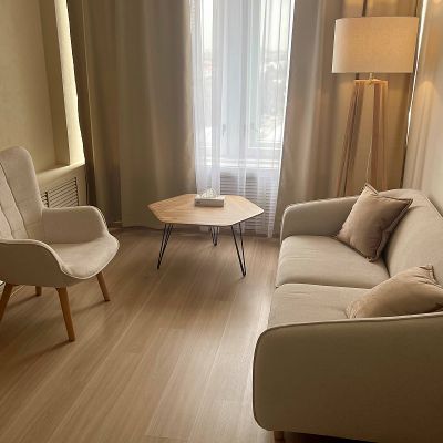 Кабинет находится в дальней части офиса. Очень тихий. Оборудован утопающим диваном повышенной комфортности, креслом, письменным столом, за которым можно проводить вебинары, видеоконференции снимать экспертный контент и просто работать с великолепным видом на город. Хорошо подходит для проведения оффлайн и онлайн консультаций, гипнотерапии, проведения эфиров, записи рилс и сторис, а также индивидуальной работы в тихой, приятной обстановке.